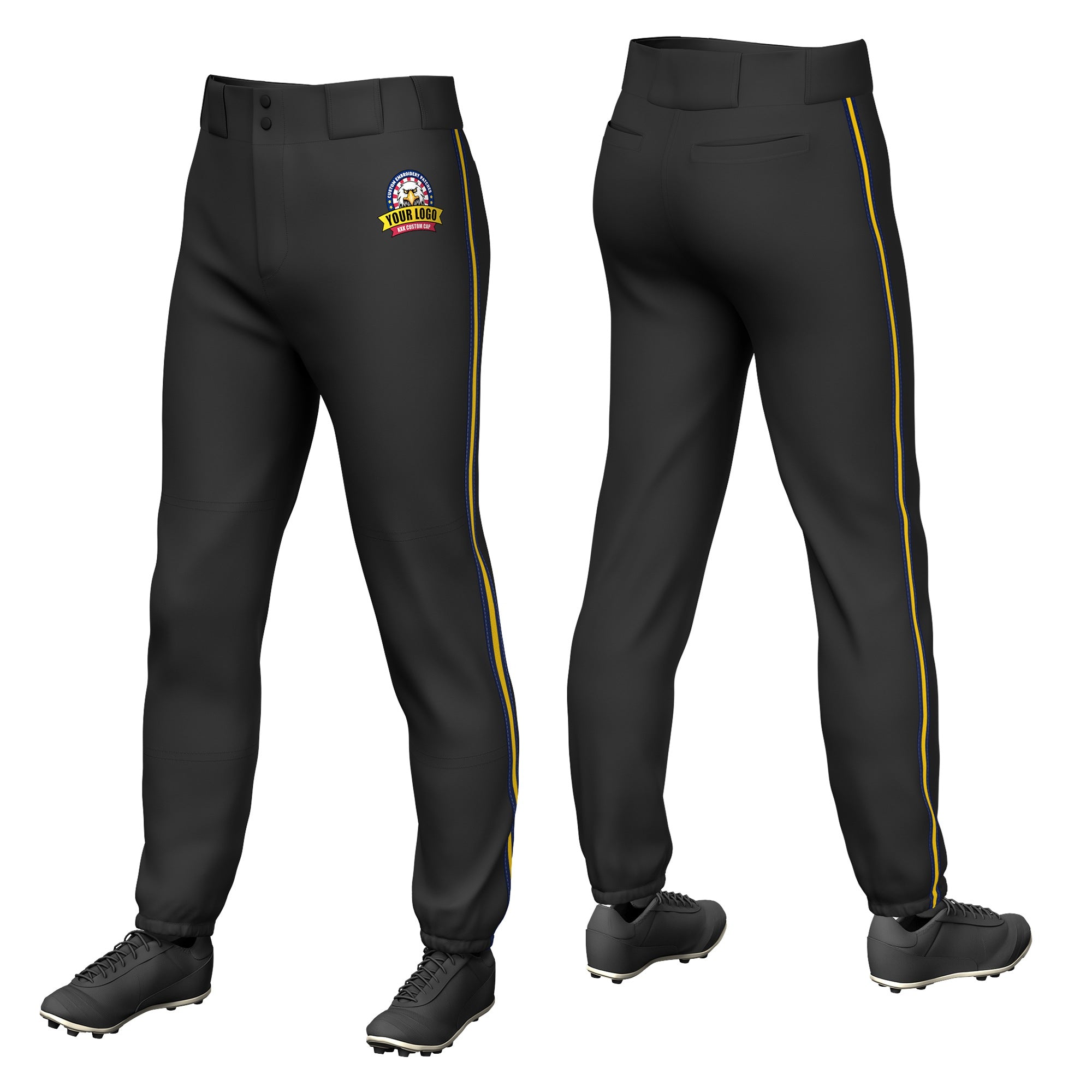 Pantalones de béisbol de práctica elásticos, de ajuste clásico, con ribetes en negro, azul marino y dorado 01, personalizados.