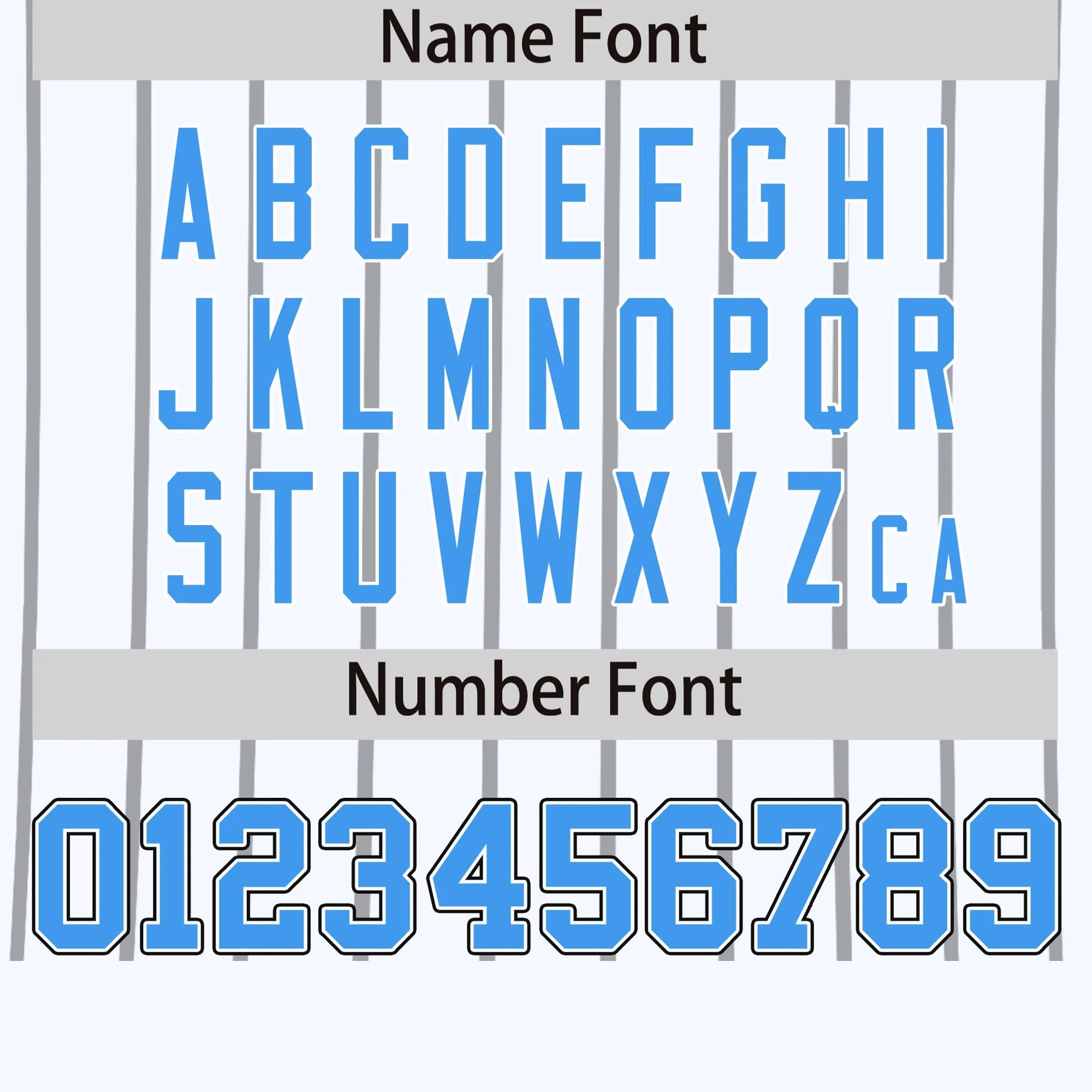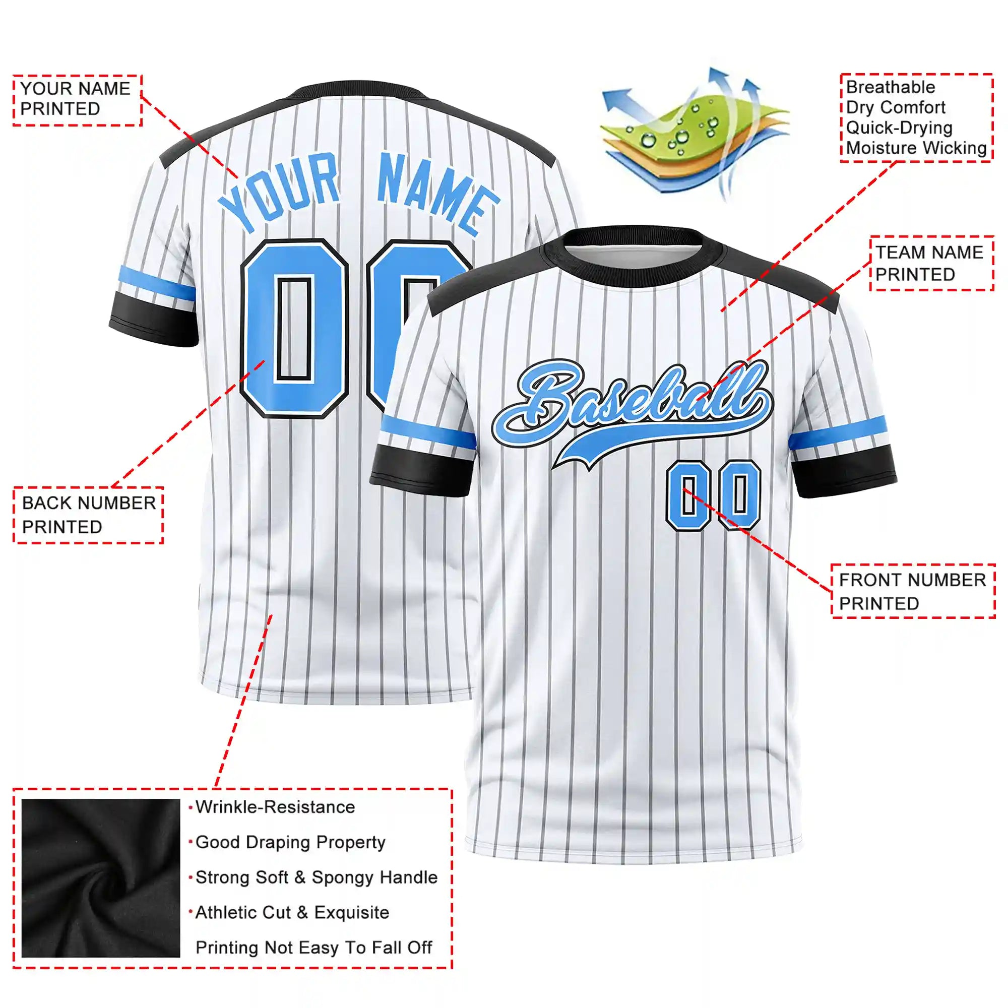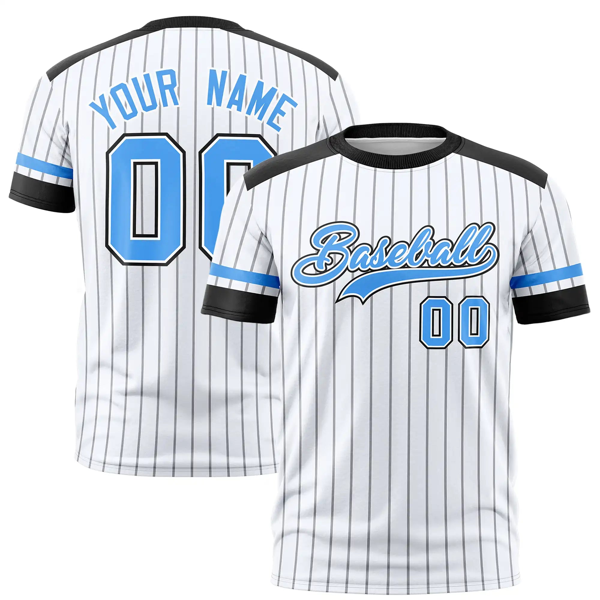 Camiseta deportiva personalizada con diseño de rayas blancas, negras y azul polvo.